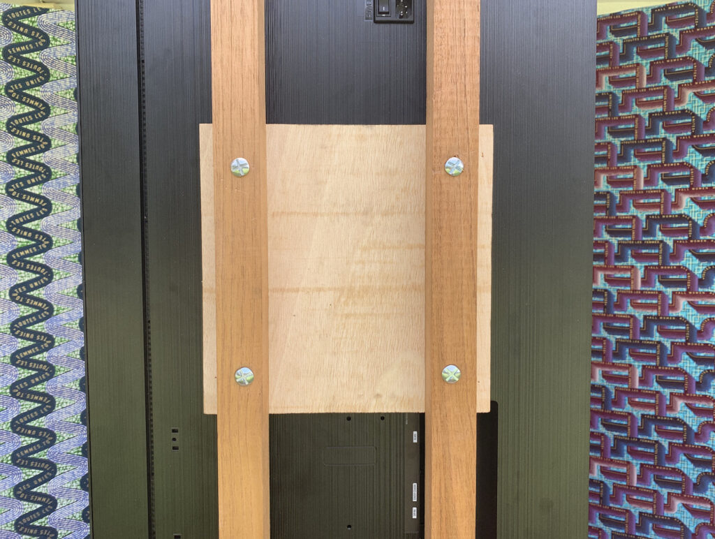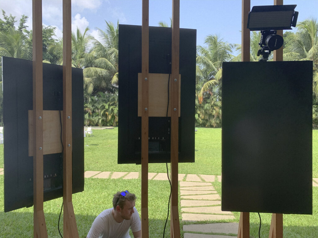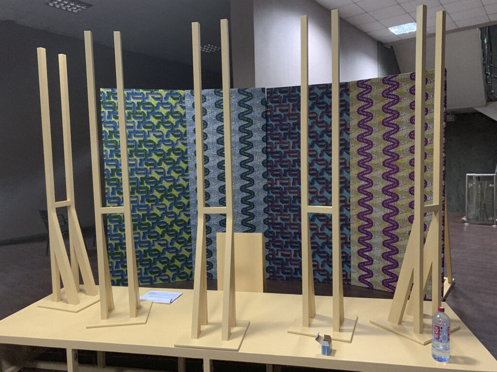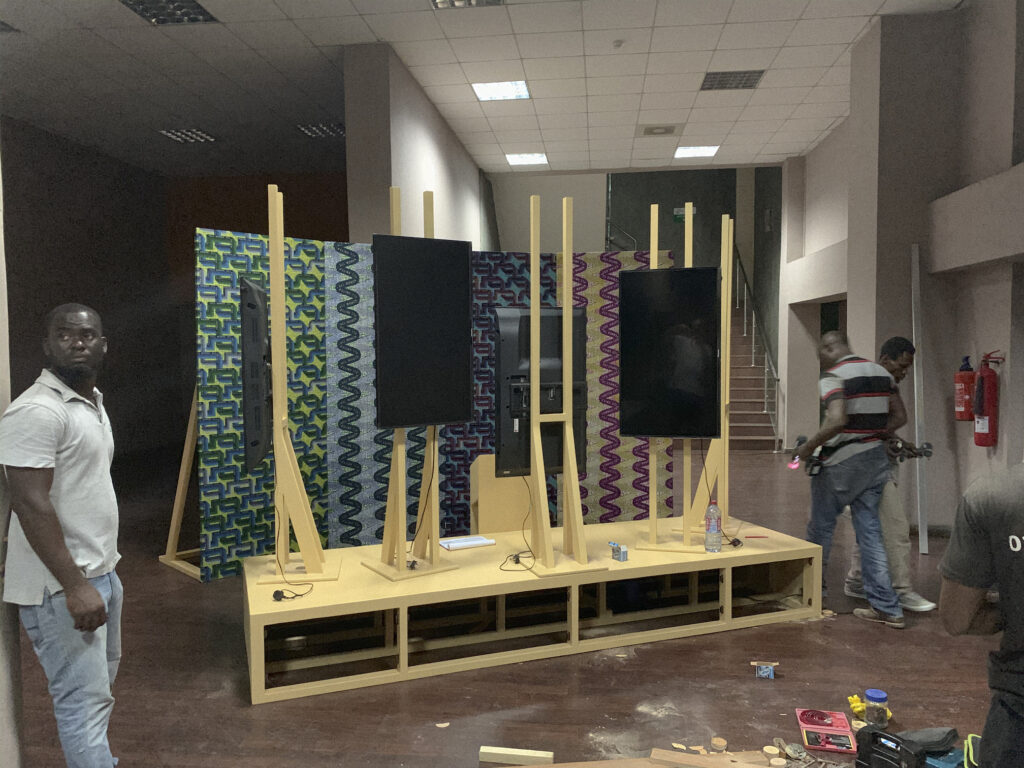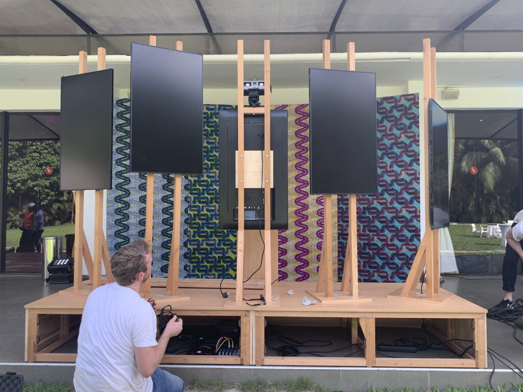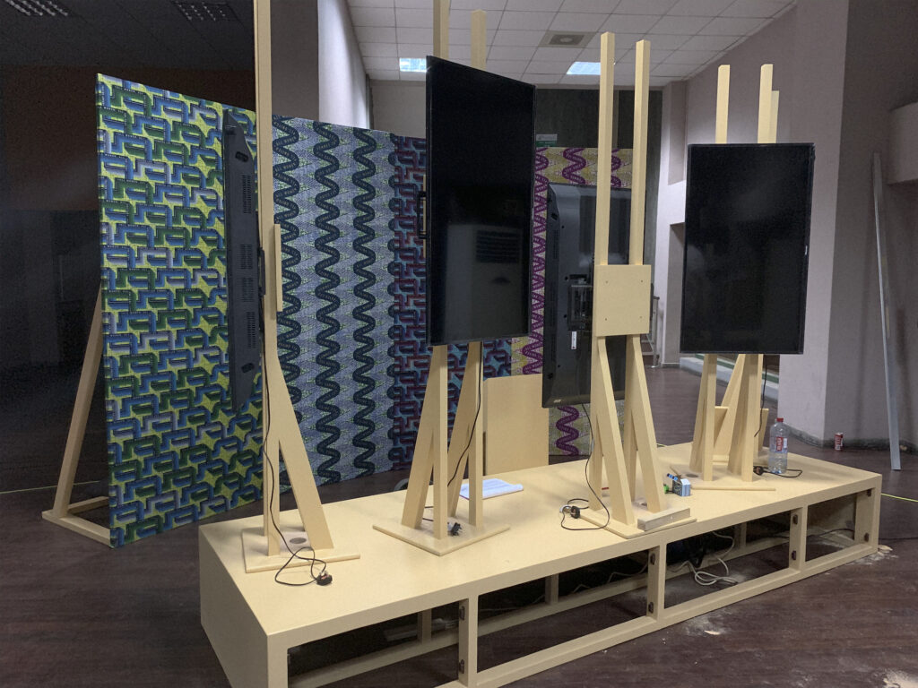 The installation itself revolves around 5 screens, showing recorded videos and Vlisco based fabric pattern animations. The center screen is used for the interface of the video recording system, the surrounding 4 screens do playback of all other videos.